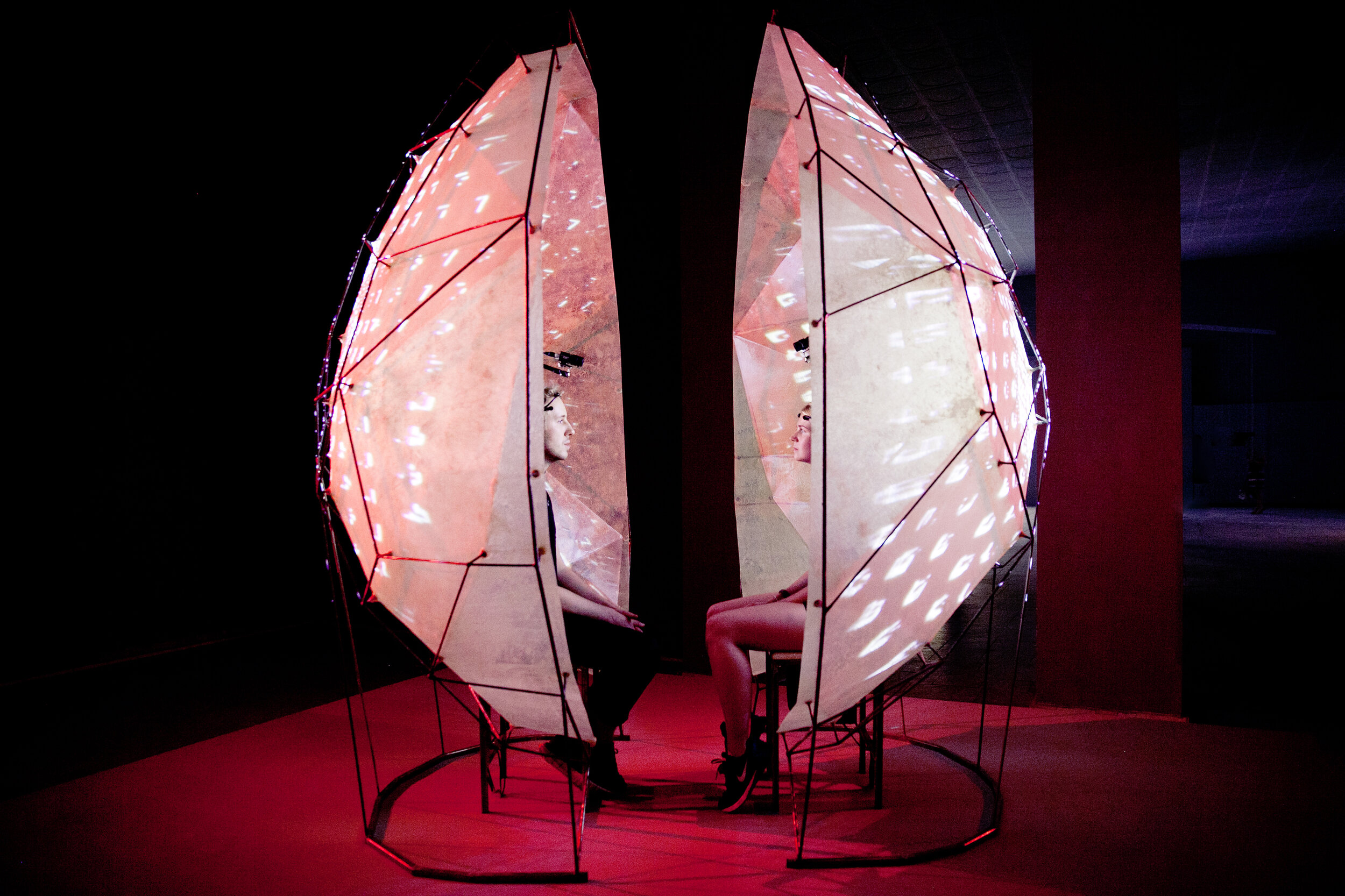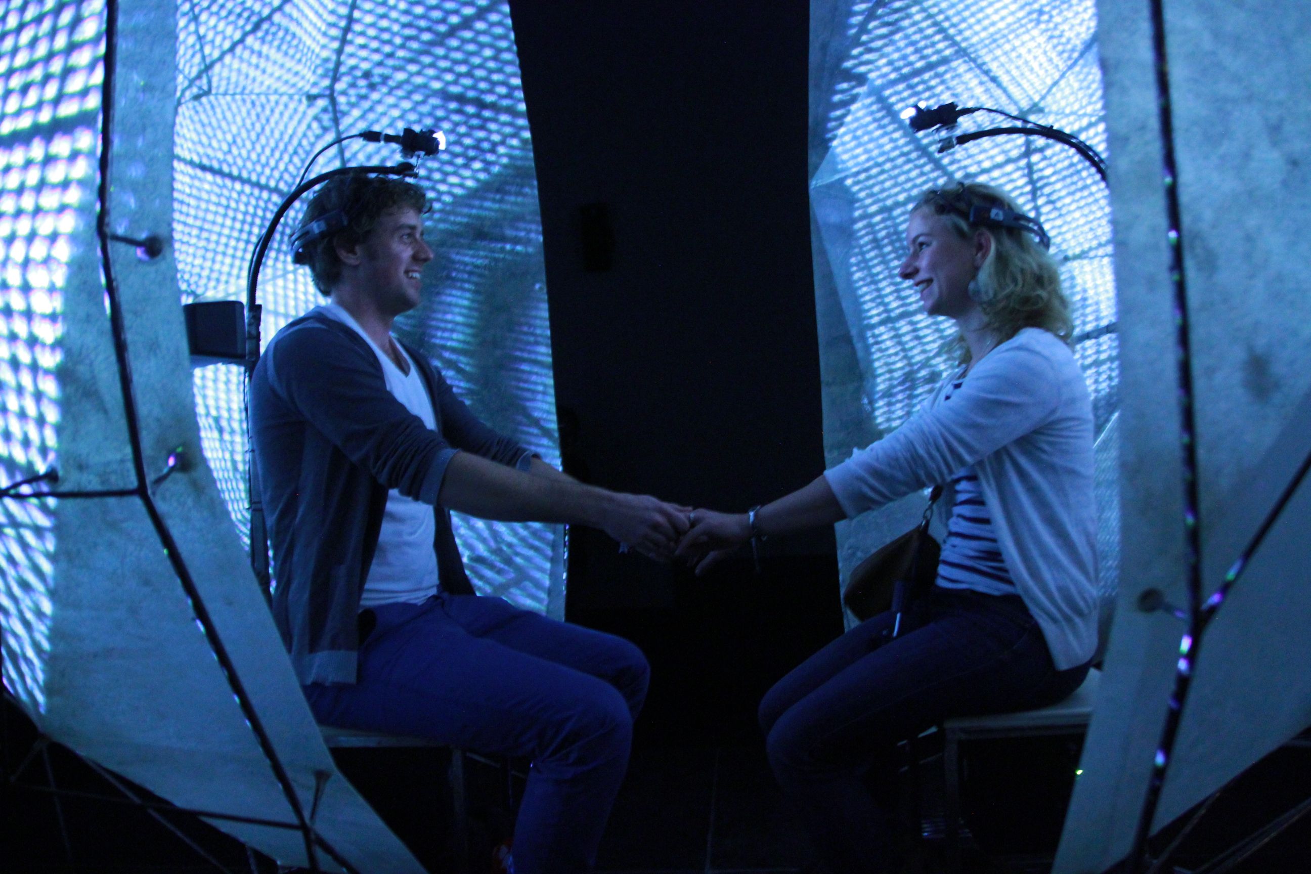 ‘Deelnemers dragen een headset waarmee hun hersengolven worden gemeten. Vervolgens krijgen ze hier zelf ook een visuele en auditieve representatie van te zien. Als de hersengolven op dezelfde golflengte zitten, resulteert dat in harmonieuze kleuren en muziek. Wanneer ze niet op dezelfde golflengte zitten, ontstaat een audiovisuele chaos. ‘Dit doen we niet alleen om een ervaring te creëren, maar ook om het onderzoek voor de deelnemers tastbaar te maken,’ legt de neurowetenschapper uit. ‘Bovendien blijkt dit bevorderend te werken: mensen die zich bewuster zijn van de feedback laten ook meer synchronisatie zien in hun hersenpatronen.’